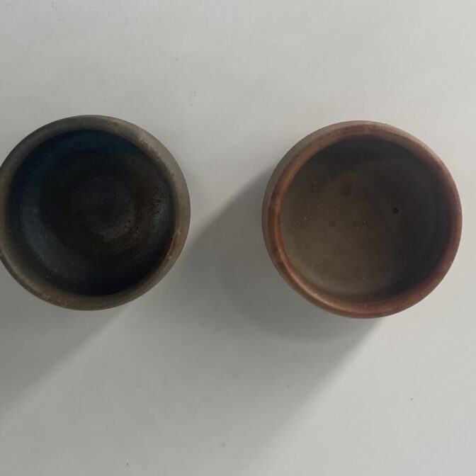 小振りなぐい呑の青備前と緋襷をペアにしました。