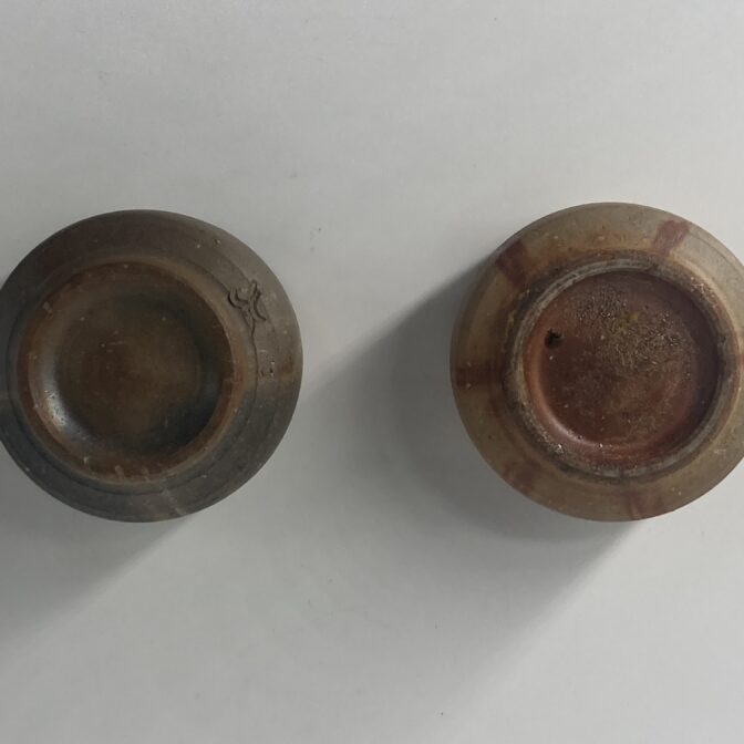 備前焼 ぐい呑2個組 青備前、緋襷 (1) 木箱入り
