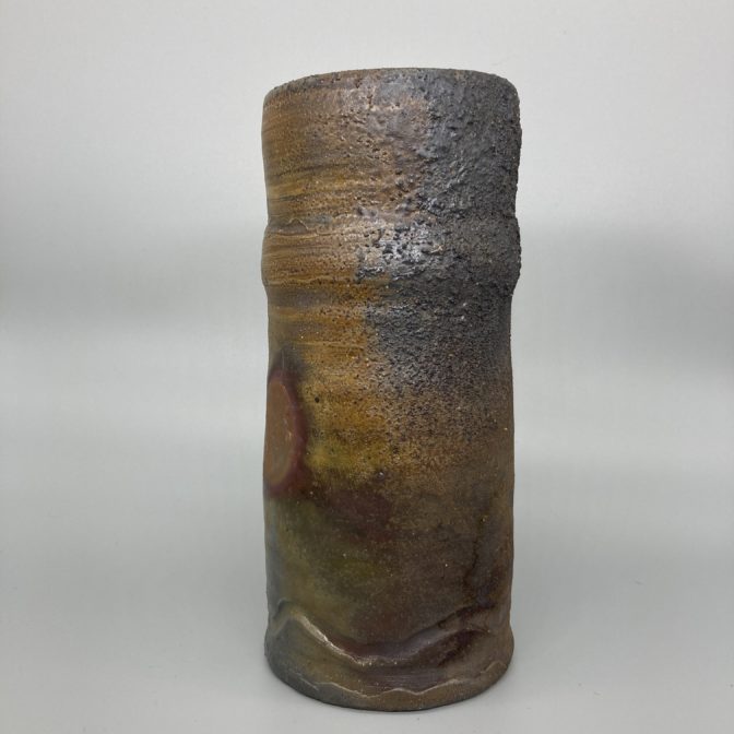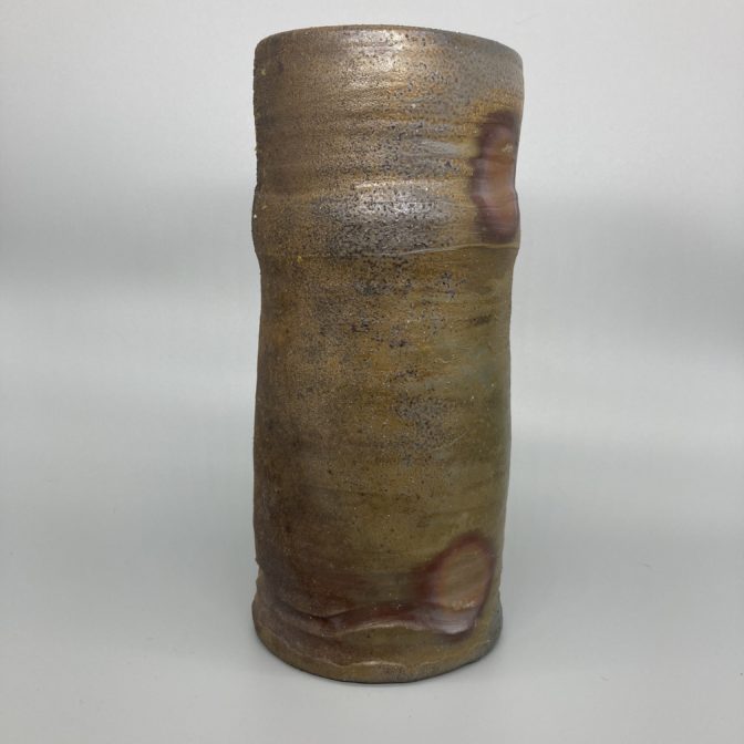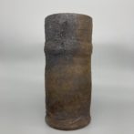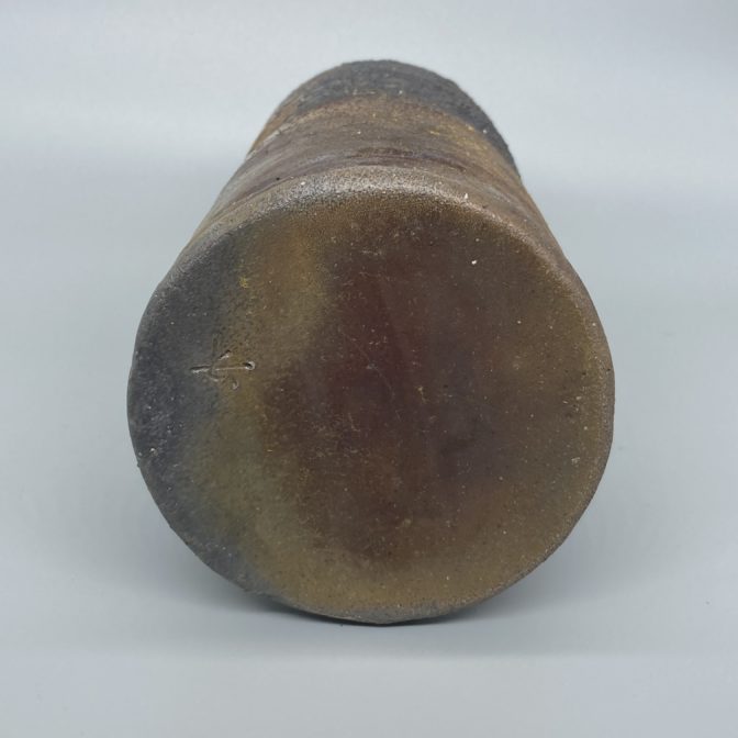 備前焼の花入れです。窯変と言われる、焼成の時窯の中の燠(灰)が溜りやすい所に横にして置きます。いろいろな色調ができるのですが、割木が飛んでいく所なので、傷が出来ることが多く貴重です。